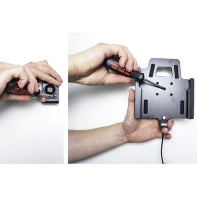 Die Halterung ist sehr stark, das Telefon klopft oder vibriert nicht darin. Die Halterung verfügt über ein Scharnier, dank dem das Telefon jederzeit problemlos horizontal oder vertikal gedreht oder gekippt werden kann. Der Halter wird am Brodit ProClip befestigt.