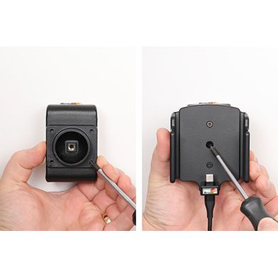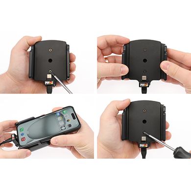 Die Halterung ist sehr stabil, das Telefon bleibt nicht darin hängen und vibriert nicht. Die Halterung verfügt über ein Scharnier, mit dem Sie das Telefon jederzeit leicht ins Hoch- oder Querformat drehen oder neigen können. Der Halter wird am Brodit ProClip befestigt.