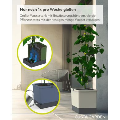 Selbstbewässerungstopf für Klettergemüse. Dank der optimalen Größe des Wassertanks brauchen Sie ihn nur alle paar Tage über das seitliche Einfüllloch mit Wasser zu befüllen. Er transportiert das Wasser gleichmäßig nach oben in die Erde und versorgt die Pflanzen immer mit der richtigen Menge Wasser – nie zu viel und nie zu wenig. Die CURT CUCUMBER Kletterhilfe lässt sich flexibel an der Wand befestigen, so dass die Pflanze am Seil hochklettern kann (Schrauben und Dübel im Lieferumfang enthalten) und so ideale Bedingungen für ein gesundes Wachstum hat. Die Pflanztruhe ist perfekt auf das Bodenvolumen der Gurkenpflanze abgestimmt und garantiert so eine ideale Nährstoffversorgung.