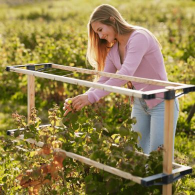 Der BERRY BUDDY ist eine stabile Stütze für alle Arten von Beeren wie Himbeeren, Brombeeren, Stachelbeeren und Johannisbeeren. Er besteht aus einer robusten Konstruktion aus hochwertigem EU-FSC-zertifiziertem Holz, 2 höhenverstellbaren Gittern mit geflochtenem Netz und Metallspitzen zur einfachen Verankerung. Die Stütze ist so konzipiert, dass sie den Bedingungen im Freien standhält und Ihr Obst optimal unterstützt. BERRY BUDDY wächst mit Ihren Beerensträuchern mit. Die höhenverstellbaren Rahmen passen sich leicht an das Wachstum Ihrer Pflanzen an und bieten flexible Unterstützung in allen Wachstumsphasen.