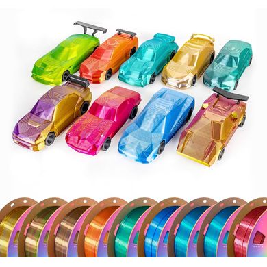 Zweifarbiges PLA-Filament mit seidigem Glanz und wechselnder Farbe je nach Betrachtungswinkel. Leicht zu bedrucken, umweltfreundliche Spule. 1,75 mm, 1 kg.