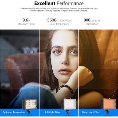 Fotolicht, 160 LEDs, 10W, Farbtemperatur 3200K oder 5600K, oranger und transparenter Filter, einstellbare Helligkeit, Lichtstrom 660 lm, Beleuchtungsstärke 900 Lux