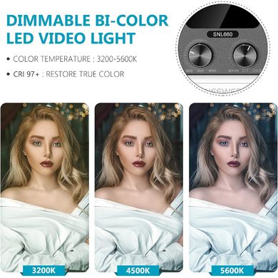 Neewer SNL660 ist ein Set aus zwei leistungsstarken Bi-Color-LED-Fotolampen mit 45 W Leistung, einer maximalen Beleuchtungsstärkevon 6800 Lux bei einer Entfernung von 0,5 Metern, einstellbarer Lichttemperatur von 3200 K bis 5600 K, einstellbarer Helligkeit und echter Farbwiedergabe. Optional ist ein Batteriebetrieb mit 2 NP-F 550/970 Batterien möglich (NICHT enthalten). Im Gegensatz zu anderen Materialien wie Kunststoff oder Edelstahl besteht das Gehäuse der Leuchte aus Aluminium in Luftfahrtqualität mit guter Wärmeableitung und Ästhetik. Hochwertige Legierung zeigt einfaches elegantes Aussehen und dauerhafte Nutzung, perfekte Wärmeableitung Design kann die Lebensdauer der Lichtplatte zu verlängern.
