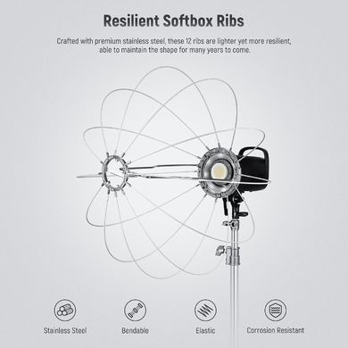 Die 12 hochflexiblen Rippen verleihen dieser Softbox eineunvergleichliche Haltbarkeit und eine makellose Laternenform für einen kreisförmigen 360°-Lichtstrahl, der sich zu Zehntausenden zusammenfalten lässt undjahrelangem Gebrauch standhält, ohne sich zu verziehen. Diffusoren mit hochreflektierenden Einsätzen können die wahre Farbwiedergabe und Farbtemperatur jedes Lichts vollständig erhalten. Ausgestattet mit einer Standard-Bowens-Halterung ist diese Softbox mit allen Bowens-Monoscheinwerfern und NEEWER-LED-Videoscheinwerfern kompatibel, einschließlich CB60, CB100, CB150, CB60 RGB und anderen.
