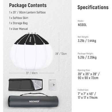 Die Softbox wiegt 1,44 kg und kann auf eine Länge von 114 cm zusammengeklappt werden. Damit ist sie kompakt genug, um sie in einerAufbewahrungstasche zu verstauenund einfach zu transportieren. Wir empfehlen die Verwendung dieser Softbox mit dem NEEWER Q4 Studio Flash Vision 4 Monolight und den Studioleuchten CB60B, CB60 RGB, CB100 C, CB150, CB200B, CB300B, FS150, FS150B und FS230 COB. Die Bowens-Halterung macht es auchkompatibel mit SmallRig, Godox und Aputure Leuchten. Für außergewöhnliche Stabilität bei starker Beanspruchung empfehlen wir das ST250R ST-260AC Fotostativ und das SC320 NEEWER C Stativ mit Auslegerarm.