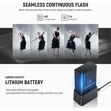 Dieser kompakte 76-Ws-Blitz wiegt nur 530 Gramm und bietet eine starke Leistung mit GN60 (ISO100, 200mm) und stabilen 5600K (±200K) Farbtemperatur. Er unterstützt TTL/M/Multi-Blitzmodi und TCM-Konvertierung für automatische Messung oder manuelles Dimmen (1/1–1/256). Außerdem unterstützt er Blitzbelichtungskorrektur (FEC), Blitzbelichtungsreihen (FEB), Blitzbelichtungsspeicherung (FEL), optische Slave-Modi (S1/S2) und weitere Funktionen. Der Lithium-Akku mit 7,4 V und 2600 mAh Kapazität sowie die mitgelieferte USB-Ladestation und das Netzteil (US-Stecker) ermöglichen bis zu 480 Blitze mit voller Leistung pro Ladung, schnelles Recyceln (1,5 s) und Blitzzeiten von 1/180 bis 1/20000 s.