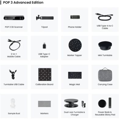 Der 3D-Scanner arbeitet mit einer Genauigkeit von 0,05 mm und kann maximal 18 Bilder pro Sekunde erstellen. Er ist schnell und genau. Die große RGB-Blende der Kamera erhöht die Farb- und Texturgenauigkeit, indem sie mehr Licht einfängt. Zwei weiße LEDs erhöhen die Helligkeit, indem sie Schatten entfernen und die Lebendigkeit der Farben erhalten. Zwei Infrarot-LEDs, Tiefenkameras und eine zusätzliche Beleuchtung sorgen für schnellere und gleichmäßigere Scans mit Lichtern. Für eine einfache und schnelle Bedienung ist der POP 3 mit drei Berührungstasten ausgestattet, mit denen sich Scans pausieren und die Belichtung der Tiefenkameras steuern lassen.
