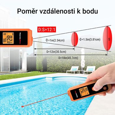 berührungsloses Thermometer, hoher Messbereich, zur Messung verschiedener Materialien, einstellbarer Emissionsgrad, Speicherfunktion, hintergrundbeleuchtetes Display, Abmessungen: 4 × 12,5 × 2,6 cm