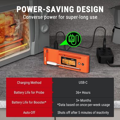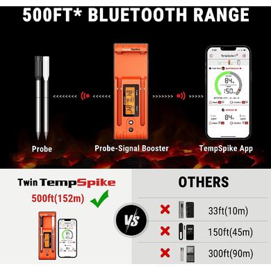 Das kabellose Küchenthermometer TempSpike TP-962 mit 2 Fühlern von ThermoPro nutzt die neueste Bluetooth 5.2-Übertragungstechnologie, um Ihnen die kabellose Zubereitung von Speisen nach Ihren Wünschen zu ermöglichen. Dieses Gerät besticht durch seinschlankes Design, da die gesamte fortschrittliche Technologie in die Sonde integriert ist und somit keine Kabel mehr benötigt werden. Dank der zuverlässigen kabellosen Verbindung kann diemitgelieferte mobile App die Temperaturmesswerte bequem aus einer Entfernung von bis zu 150 Metern überwachen. Das Thermometer wird mit zwei kabellosen Fleischsonden geliefert, die jeweils mit separaten Sensoren ausgestattet sind, die eine eingehende Analyse der Lebensmitteltemperatur (innen und an der Oberfläche) und der Umgebung ermöglichen.