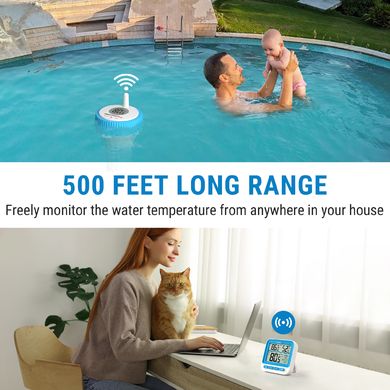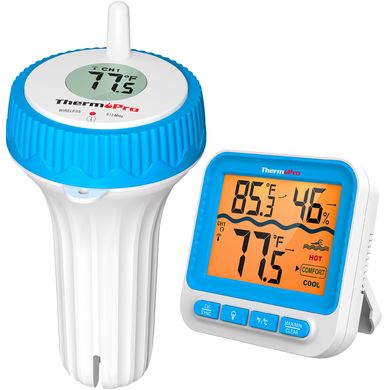 ThermoPro TP211B kabelloses Poolthermometer mit einer Reichweite von bis zu 152 m, das sowohl die Wasser- als auch die Lufttemperatur misst, mit beleuchtetem Display und langlebigem Schwimmsensor.