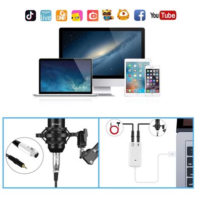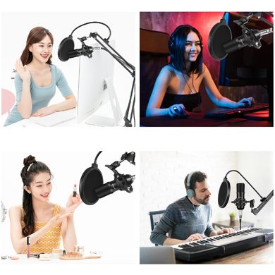 Komplettes professionelles Mikrofon-Kit, Nierencharakteristik, eingebauter dreipoliger XLR-Anschluss, gepolsterte Halterung, Stativ, Poppfilter, Schaumstoffhülle, Kabel, DSP