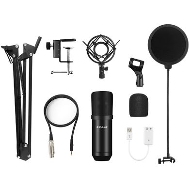 Das Set besteht aus einem PULUZ-Mikrofon, einem Stativ mit Tischklemme, einem