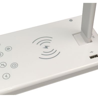 LED-Tischlampe, 3 Lichttemperaturen. 5 Lichtstärken, 10W kabelloses Ladegerät, USB-Ladeausgang, Uhr, Wecker, Kalender, Thermometer.