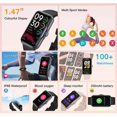 Fitness-Armband, geeignet für Android und iOS, Bluetooth 5.2, sportliche Aktivität, Benachrichtigungen, Health-Tracking-Funktion, Akku bis zu 20 Tage, TFT 1,47'' Display