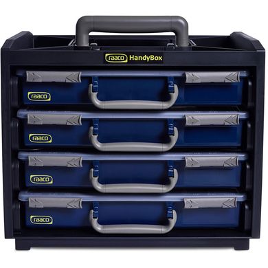 Suchen Sie eine praktische Lösung, um Ihre Schrauben, Bits, Dübel und Kleinwerkzeuge übersichtlich, leicht zu transportieren und immer griffbereit aufzubewahren? Die Raaco HandyBox 55 ist eine robuste und intelligent konzipierte Aufbewahrungsbox, die Sie in der Werkstatt, auf der Baustelle und im Außendienst nicht im Stich lässt. Dank vier herausnehmbaren Fächern (Assorter 55) mit insgesamt 64unterschiedlich großen Fächernbehalten Sie den Überblick – und an die Stelle des Chaos tritt systematische Ordnung.