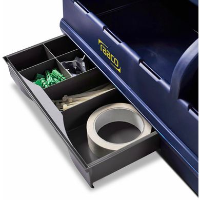 Die Box ist aus strapazierfähigem, recyceltem Polypropylen gefertigt, so dass sie dem täglichen Gebrauch in der Werkstatt, auf der Baustelle und in der Garage problemlos standhält. Das obere, offene Fach ist in drei separate Fächer unterteilt – zwei kleinere und ein größeres -, so dass sich die Werkzeuge leicht nach Art oder Verwendung trennen lassen. Unten befindet sich eine praktische Schublade für Schrauben, Dübel oder andere Kleinteile, die Sie sicher aufbewahren, aber schnell erreichen wollen.