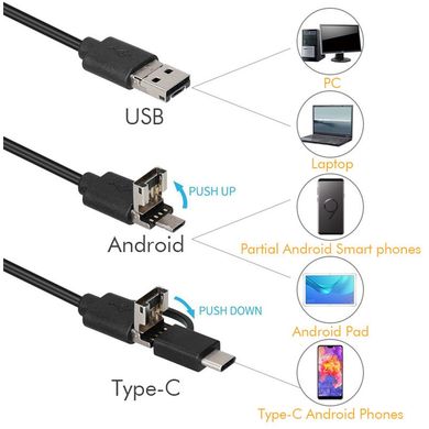 Die Möglichkeit, das Endoskop sowohl an ein Mobiltelefon als auch an einen Laptop oder Desktop-PC anzuschließen, gewährleistet eine einfache Bedienung. Für den Anschluss an ein Mobiltelefon ist es erforderlich, dass das Telefon (oder Tablet) die USB-OTG-Funktion unterstützt (z.B. Samsung Galaxy S8, Google Pixel, Nexus 6P, HTC 10, usw.) Das Endoskop ist für Android-Betriebssystemegeeignet und unterstützt auch Windows 2000/XP/Vista/Windows 7/8/10 und Mac OS.
