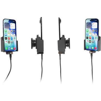 Halterung mit Scharnier für Mobiltelefone mit oder ohne Gehäuse, 70 bis 83 mm breit und 2 bis 10 mm dick, mit versteckter Stromversorgung. Aufladen über USB-C-Anschluss. AMPS-Löcher sind auf dem Haltergelenk vorgebohrt, um den Halter zu befestigen.