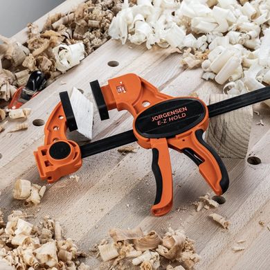 Die Einhand-Schnellspannzwinge Pony Jorgensen E-Z Hold Medium Duty in der Größe 36" (91 cm) bietet eine zuverlässige Leistung, die sowohl professionelle Tischler als auch Heimwerker zu schätzen wissen. Dank der Konstruktion aus widerstandsfähigem Kunststoff und einer Schiene aus Stahl mit Endanschlag bewältigt diese Zwinge eine Spannkraft von bis zu 136 kg, ohne an Präzision oder Bedienkomfort einzubüßen.