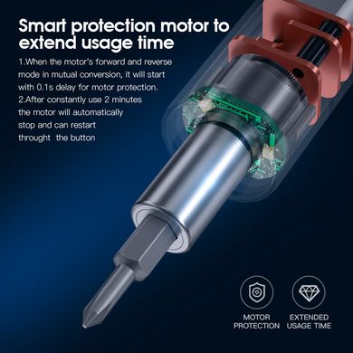 Mit einem elektrischen Drehmoment von 0,3–0,45 N-m, einer Leerlaufdrehzahl von bis zu 300 U/min und einem manuellen Drehmoment von bis zu 3 N-m bewältigt dieser Schraubendreher sowohl alltägliche als auch anspruchsvollere Aufgaben. Der intelligente Motorschutz sorgt für eine lange Lebensdauer – eine kurze Verzögerung wird beim Richtungswechsel aktiviert und der Motor schaltet sich nach zwei Minuten Dauerbetrieb automatisch ab. Wenn das Werkzeug klemmt, schaltet das System blitzschnell ab, um eine Überhitzung zu vermeiden.