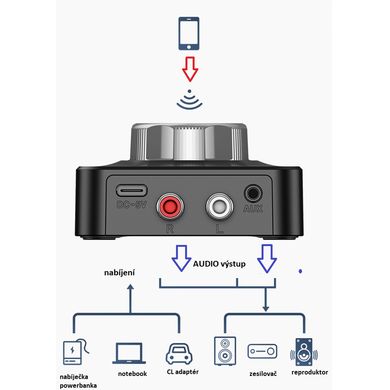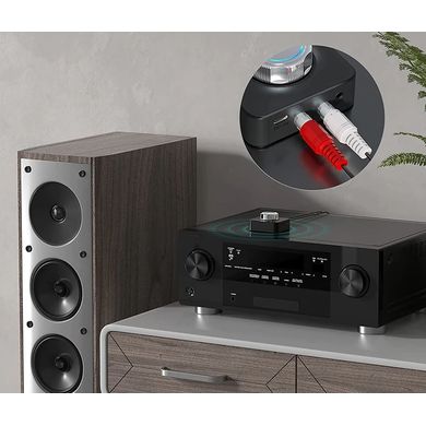 Bluetooth-Empfänger zur kabellosen Verbindung von Audiosystemen mit Mobiltelefonen, 3,5 mm Audio- und Cinch-Anschlüsse, USB-C-Stromversorgung, Reichweite ca. 10 m