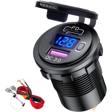 Einbausteckdose mit Voltmeter, geeignet für Motorräder und PKW, USB- und USB-C-Anschluss, PD- und QC 3.0-Unterstützung, blaues LCD, Einbauöffnung 30 mm