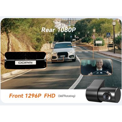Duale Autokamera mit 1296P+1080P Auflösung, Weitwinkelobjektiv, NightVIS Nachtsicht, H.265 Kompression und Parkmodus für umfassenden Schutz des Fahrzeugs.
